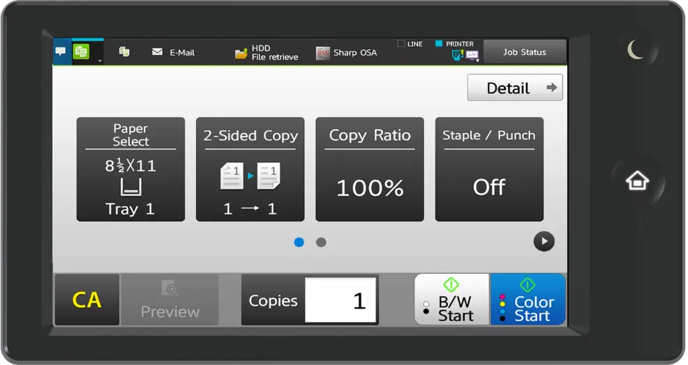 Use one of the Easy Modes for fast, simple operation, with basic functions displayed in large, clearly-labeled tiles and keys. Easy Modes are available for the standard copy and scan functions, as well as for the optional fax expansion kit. And for more advanced features, just touch the “Detail” button–it’s that easy